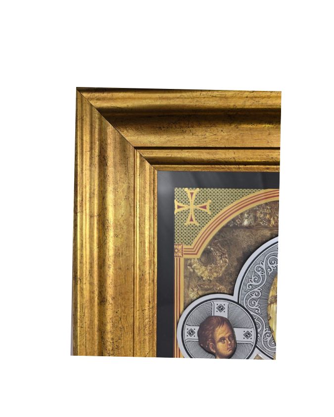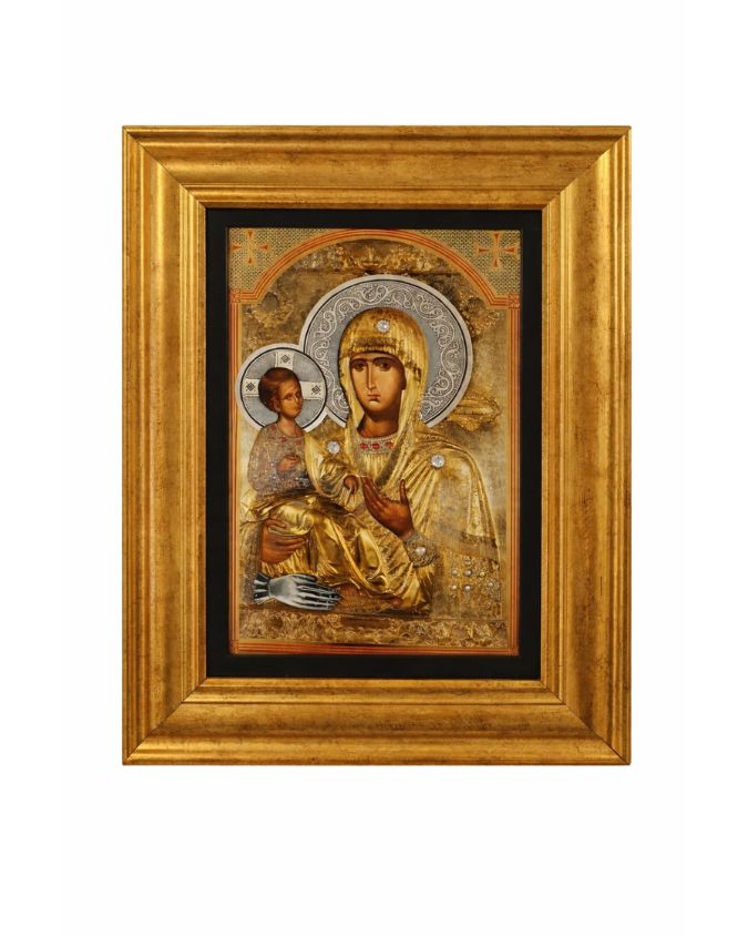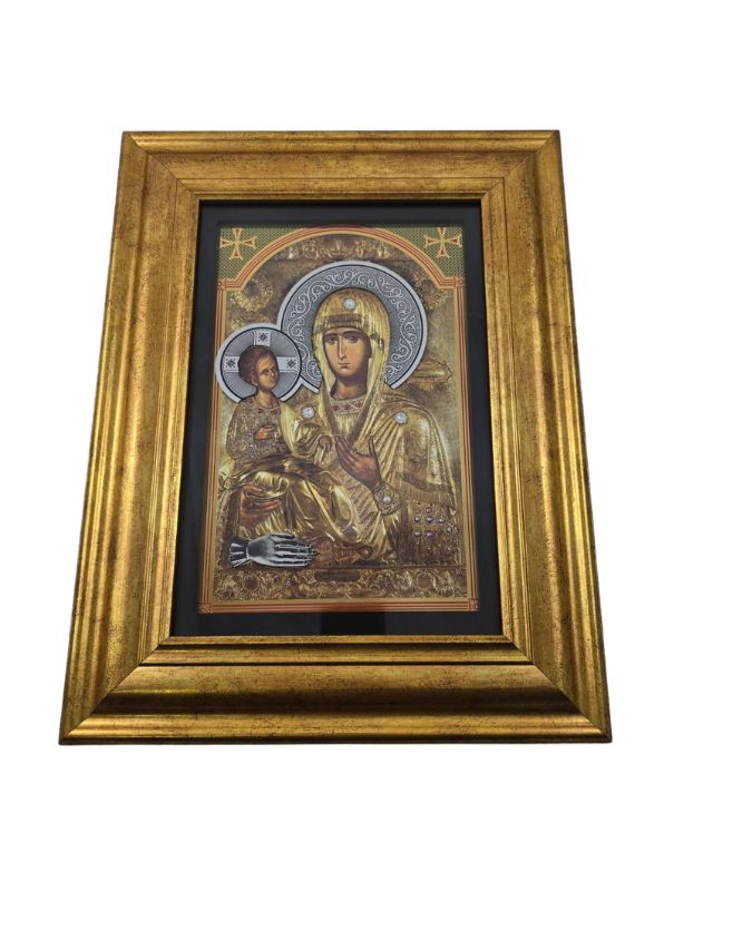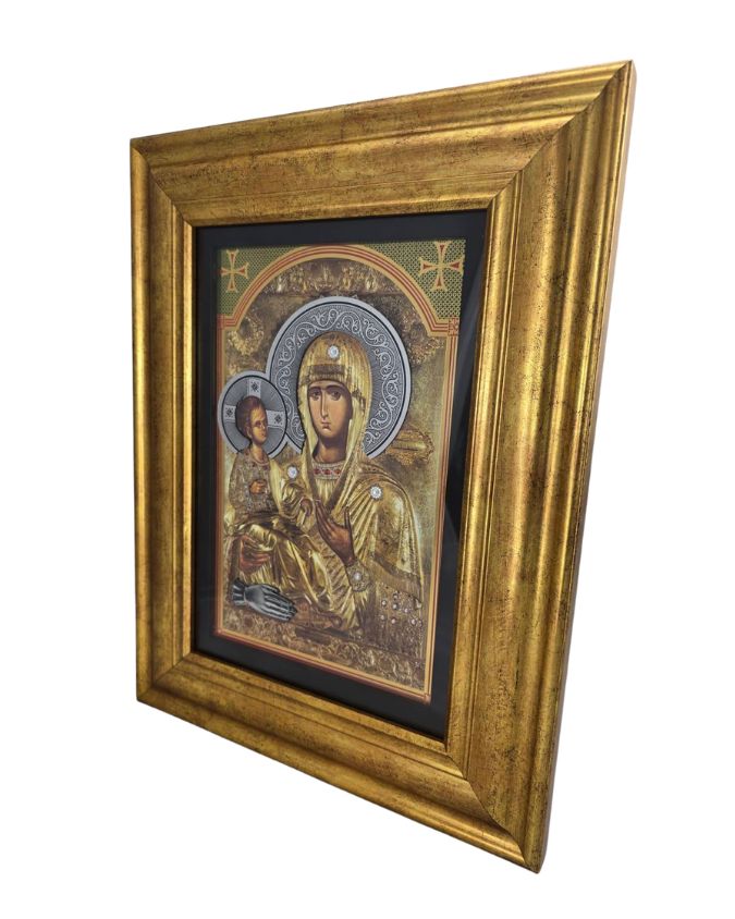 Ikona Bogorodice Trojeručice izradjena u zlatotisku sa prelepim ukrasima i cirkonima. Krasi je masivni ukrasni ram od drveta. Ikona Trojeručica je takodje opremljena antireflex staklom koji odbija sve odsjaje i efekte ogledala za potpuni doživljaj. Može krasiti vaš dom, takodje može biti luksuzni poklon vašim dragim osobama, prijateljima za svaku priliku, bilo da je rodjendan, neki jubilej ili neka prilika koju treba obeležiti. Ikona Trojeručice- lux masiv je pravi zbor za vas.